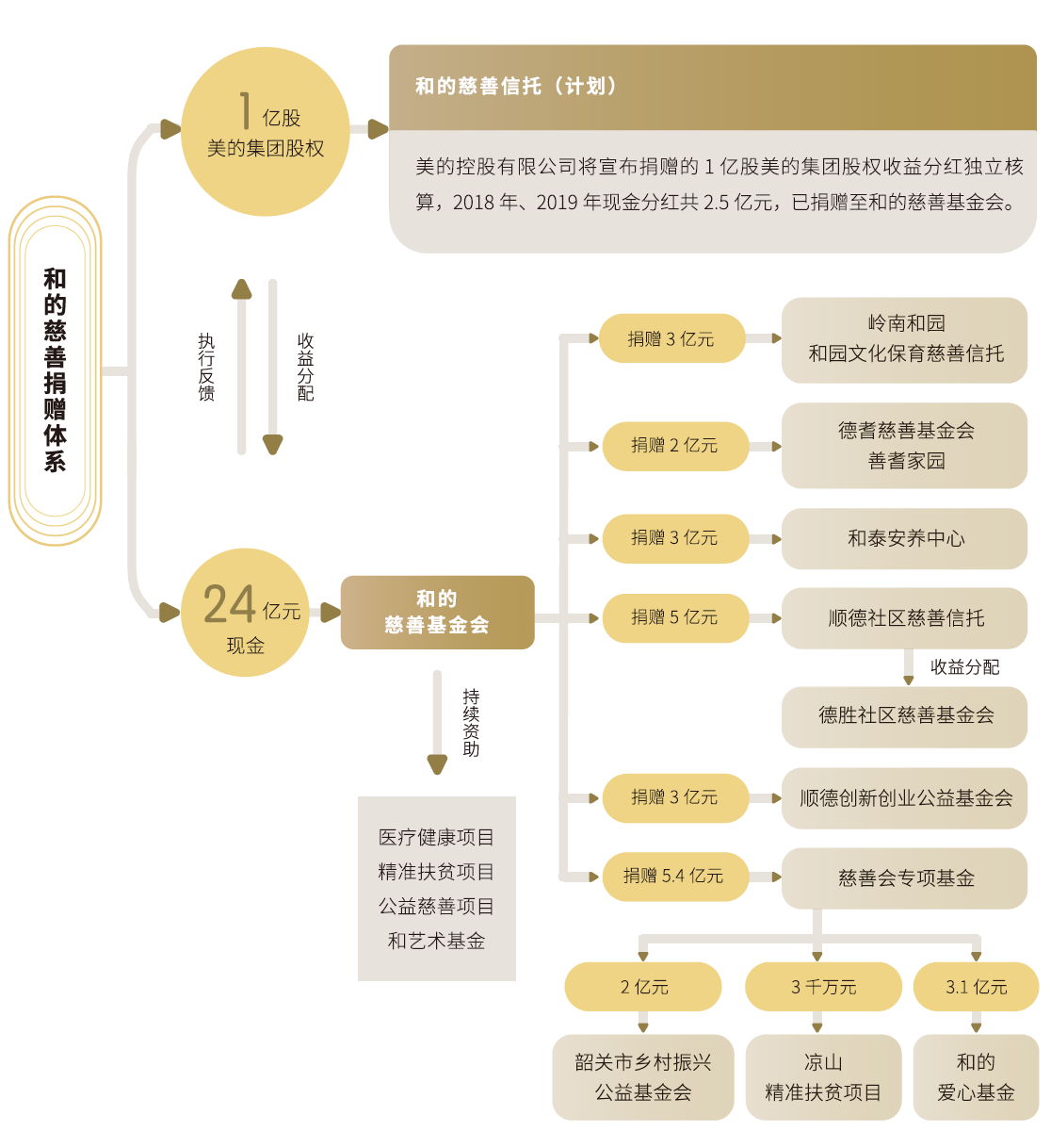 1亿股美的集团股票捐赠将设立一个永续的慈善信托“和的慈善信托(计划)”,慈善信托财产及收益将全部用于支持公益慈善事业的发展;在“和的慈善信托(计划)”正式落地之前,捐赠的1亿股美的集团股权的收益分红独立核算,直接捐赠至和的慈善基金会。